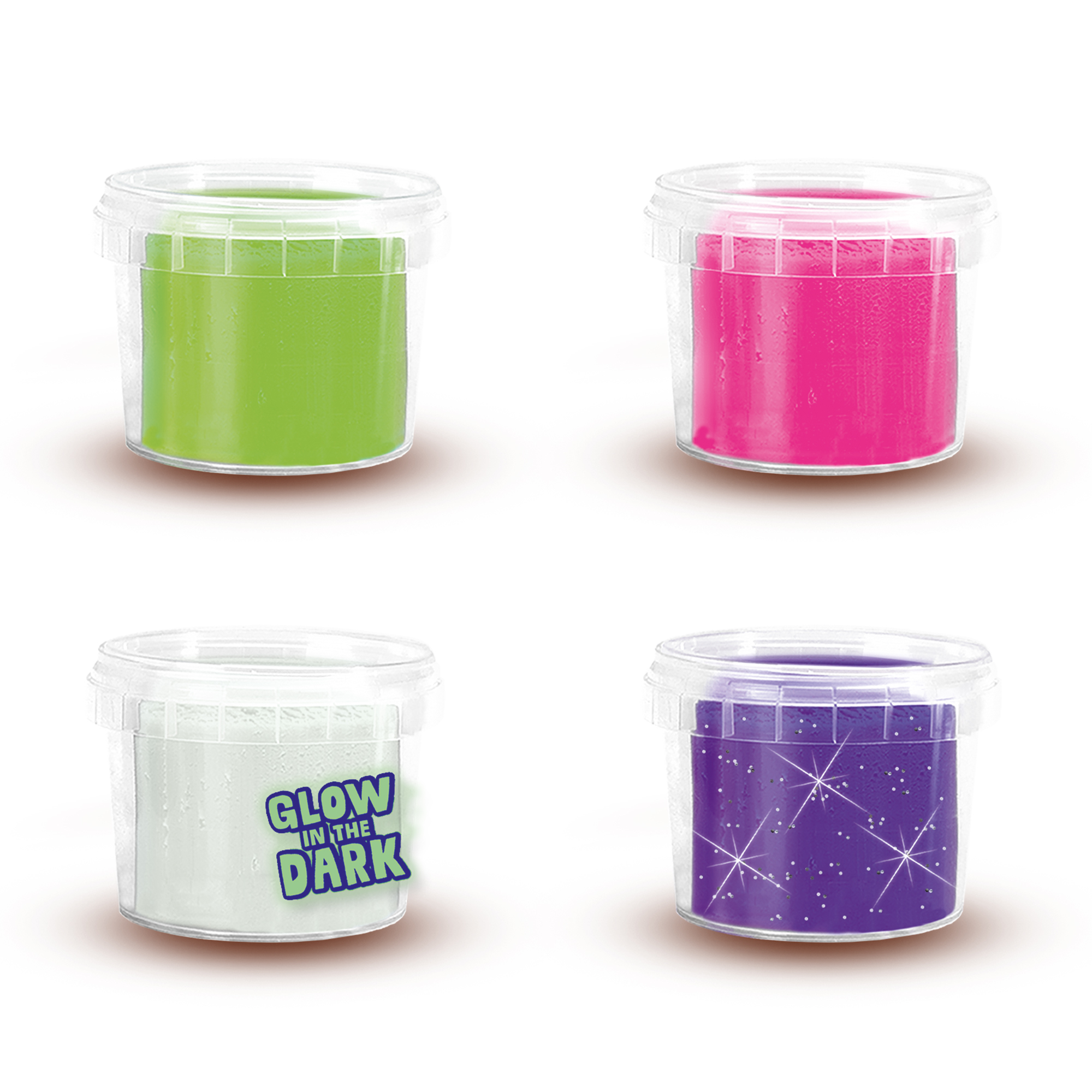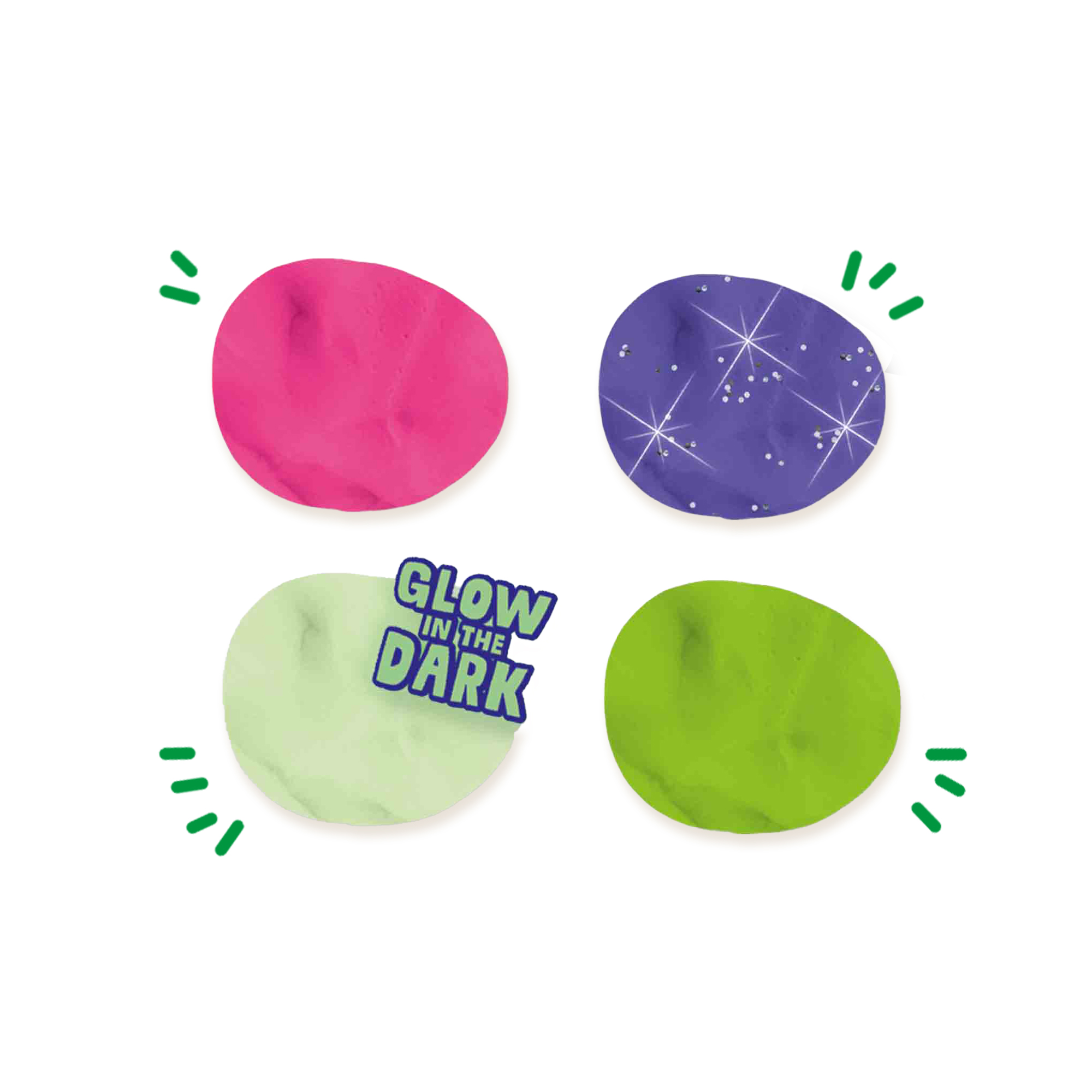 De Feel good klei – Glow bestaat uit de heldere kleuren neon roze, glitter paars, licht groen en glow in the dark.
